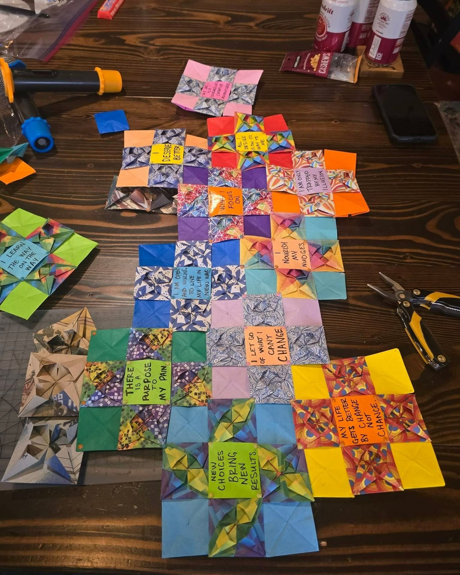 This mannequin is clothed with an intricately woven origami skirt, covered with inspirational & positive quotes; urging the viewer to stay forward focused.
